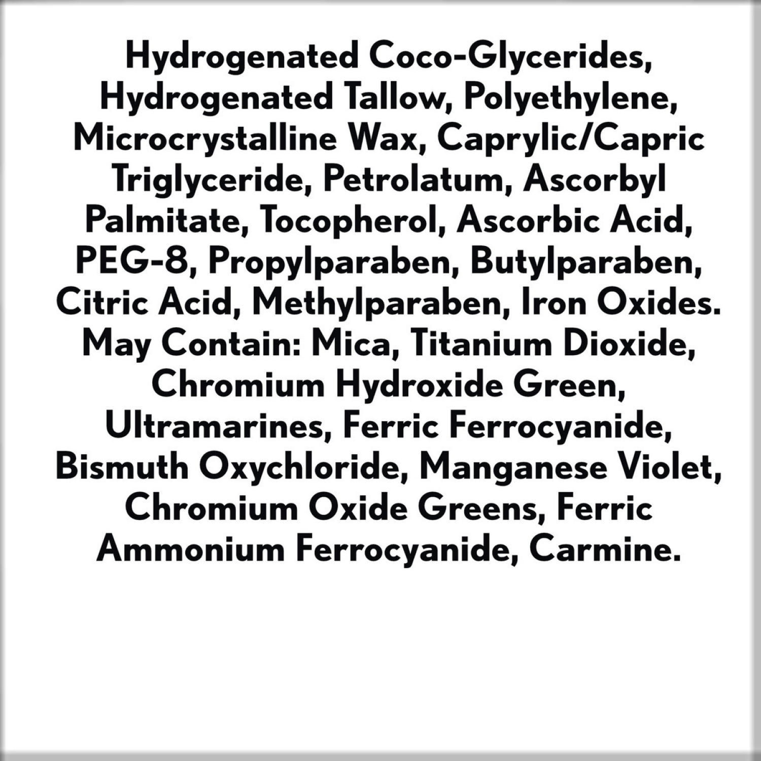 Hydrogenated Palm Kernel Glycerides, Synthetic Japan Wax, Hydrogenated Castor Oil, Hydrogenated Palm Kernel Oil, Palmitic Acid, Stearic Acid, C10-18 Triglycerides, Cetyl Palmitate, Copernicia Cerifera…