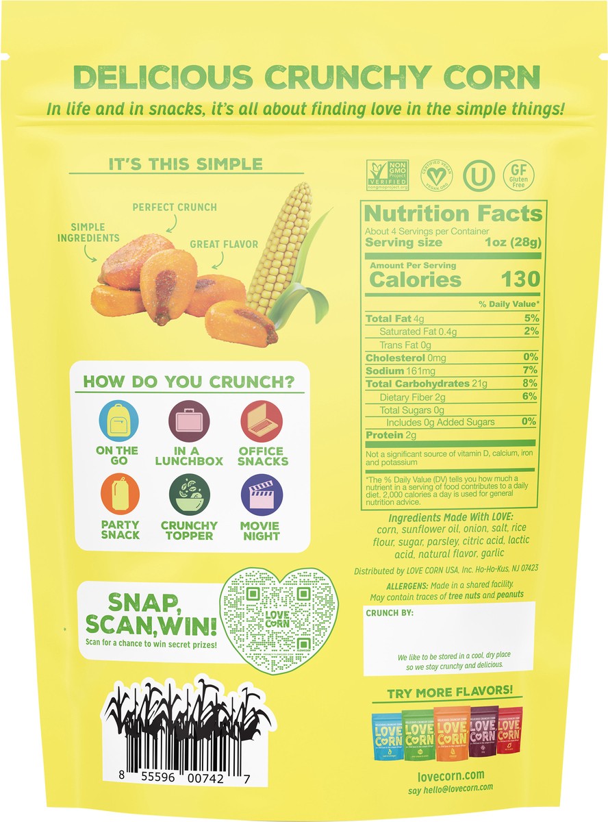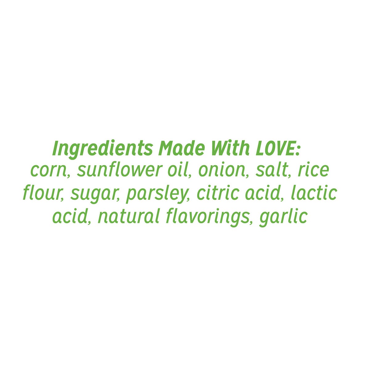Ingredients Made with Love: Corn, High Oleic Sunflower Oil, Onion, Salt, Rice Flour, Sugar, Parsley, Citric Acid, Lactic Acid, Natural Flavorings, Garlic.