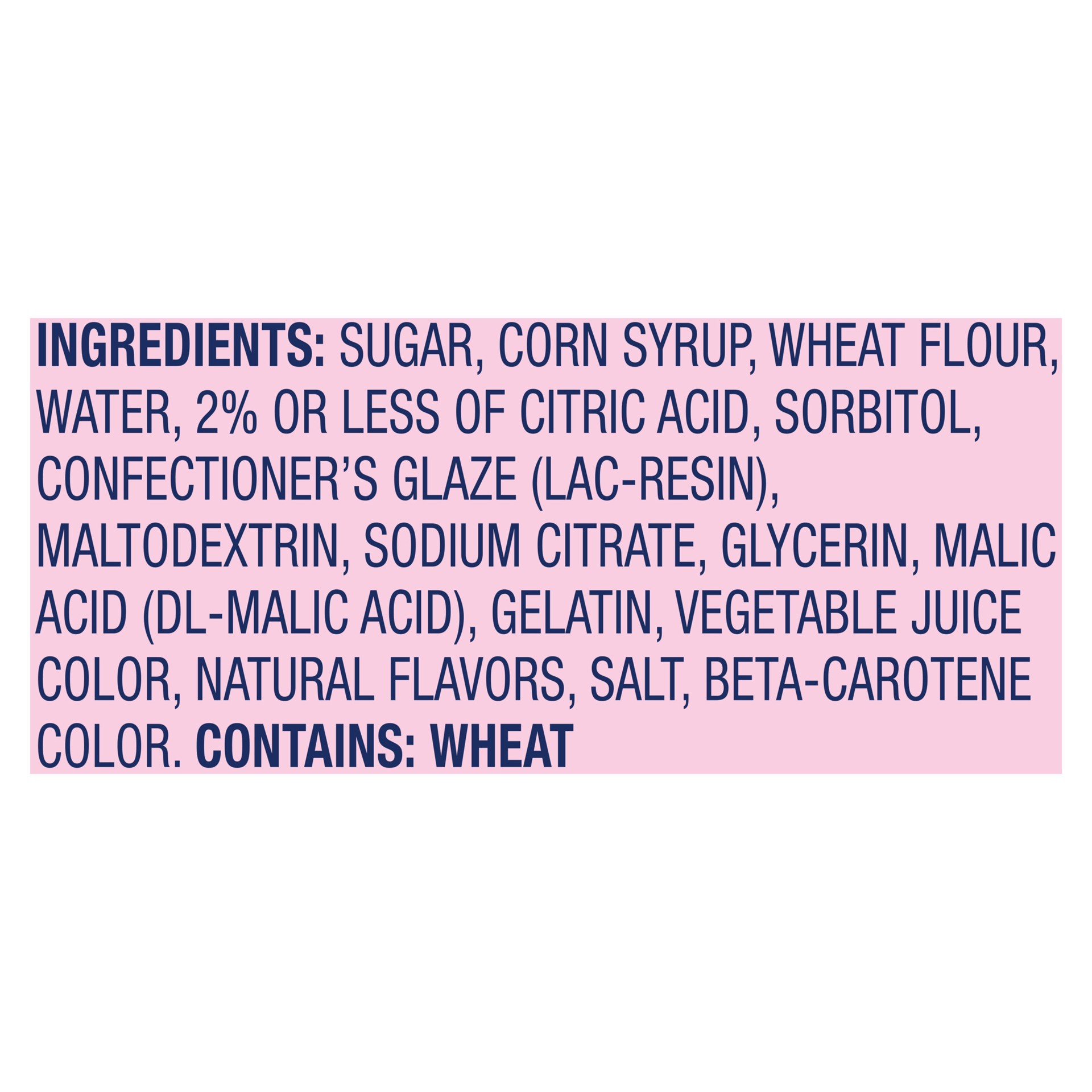 Sugar, Corn Syrup, Wheat Flour, Water, Contains 2% or Less of Citric Acid, Sorbitol, Maltodextrin, Sodium Citrate, Glycerin, Malic Acid (DL-Malic Acid), Confectioner's Glaze (Vegetable Oil [Coconut, C…