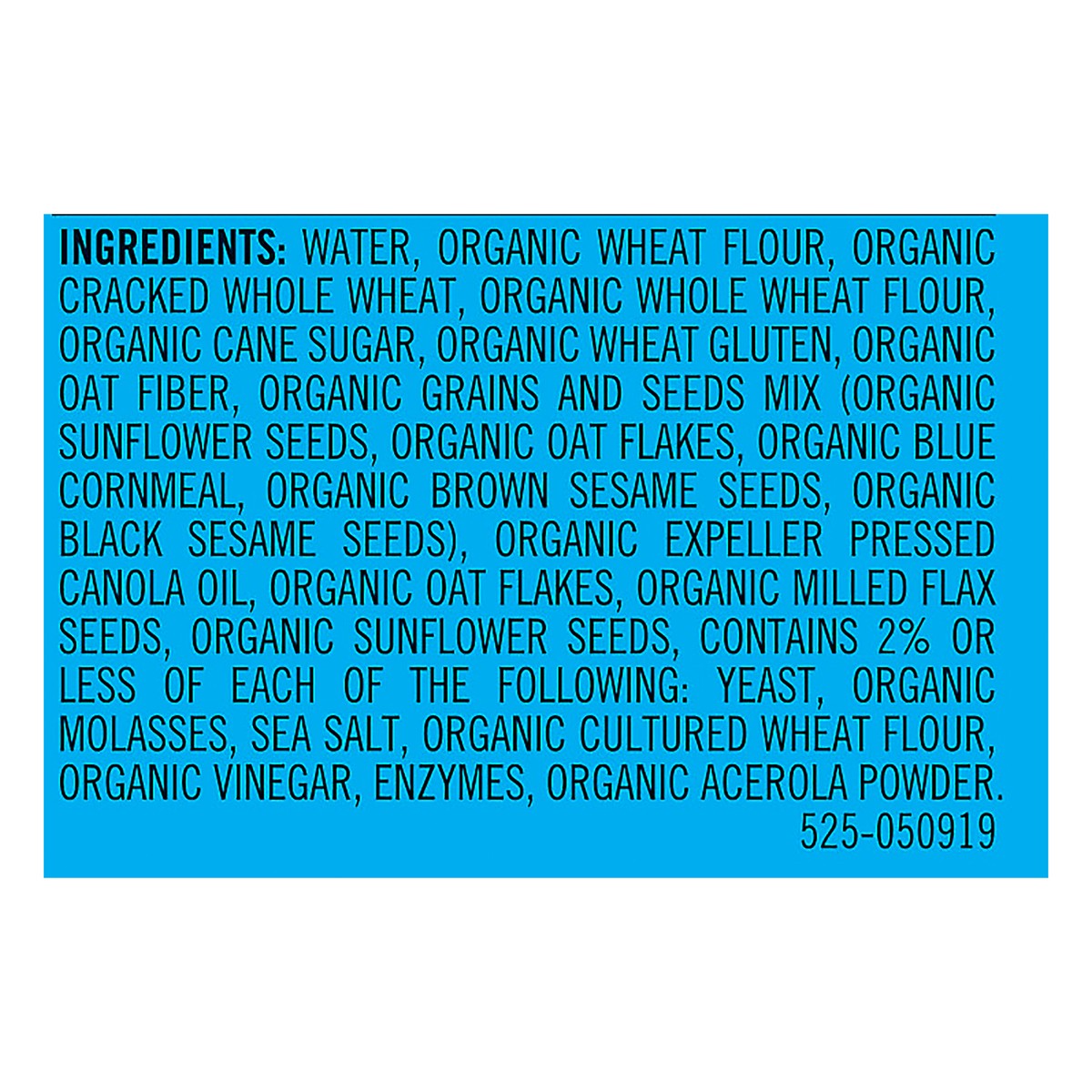 Water, Organic Wheat Flour, Organic Cracked Whole Wheat, Organic Whole Wheat Flour, Organic Cane Sugar, Organic Wheat Gluten, Organic Oat Fiber, Organic Grains and Seeds Mix (Organic Sunflower Seeds, …