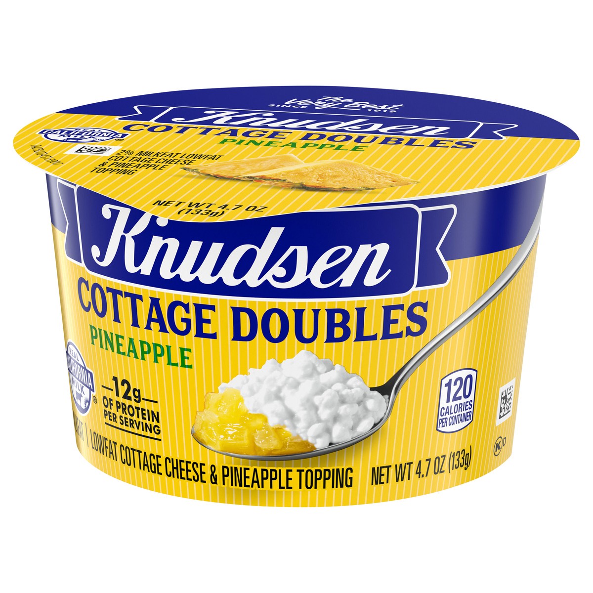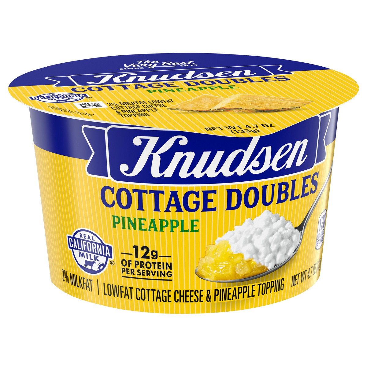 - Knudsen Low Fat 2% Milkfat Cottage Cheese Doubles with Pineapple Topping offers an on the go snack