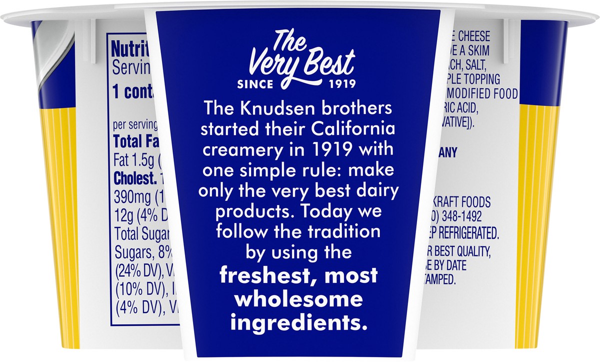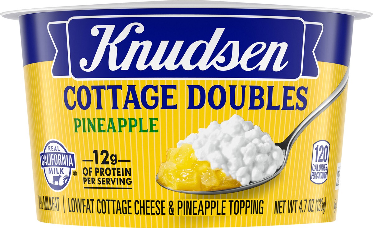 - One 4.7 oz cup of Knudsen Low Fat 2% Milkfat Cottage Cheese Doubles with Pineapple Topping