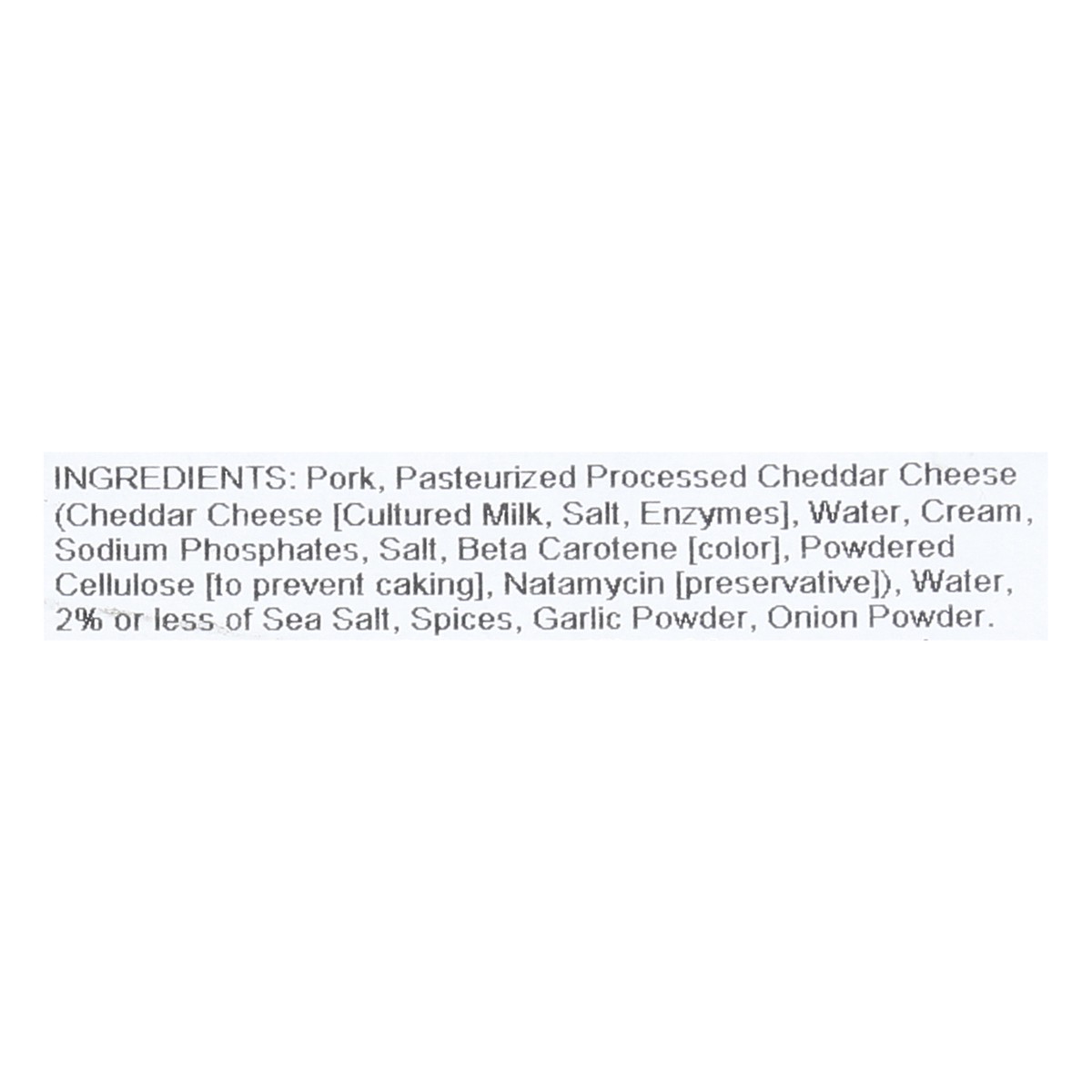 Pork, Pasteurized Processed Cheddar Cheese (Cheddar Cheese [Cultured Milk, Salt, Enzymes], Water, Cream, Sodium Phosphates, Salt, Beta Carotene [Color], Powdered Cellulose [to Prevent Caking], Natamyc…