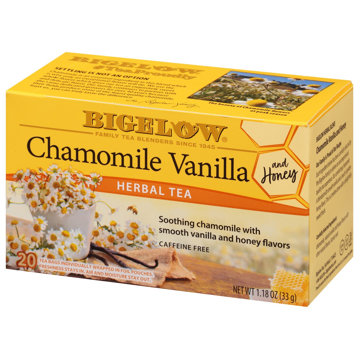 - Soothing Chamomile with smooth vanilla and a touch of golden honey flavor