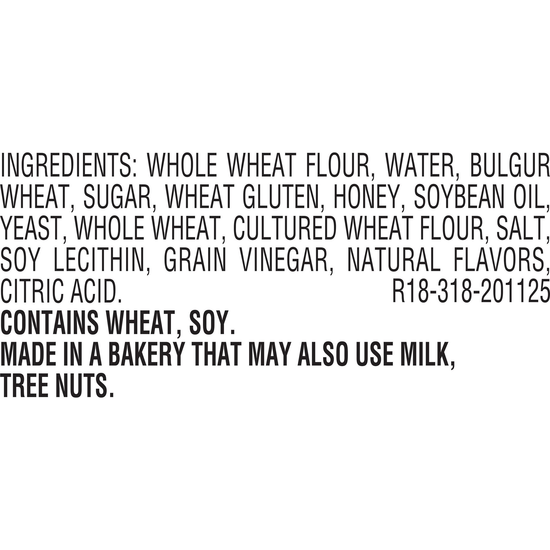 Whole Wheat Flour, Water, Bulgur Wheat, Sugar, Vegetable Oil (Soybean), Wheat Gluten, Whole Wheat, Honey, Yeast, Sea Salt, Natural Flavors, Fermented Wheat Flour, Grain Vinegar, Soy Lecithin, Citric A…