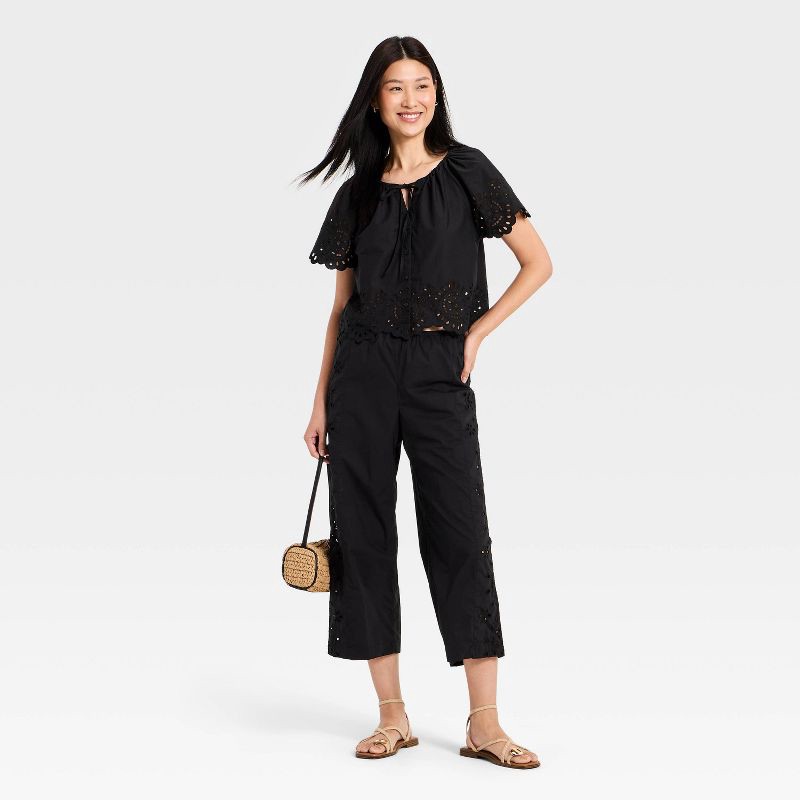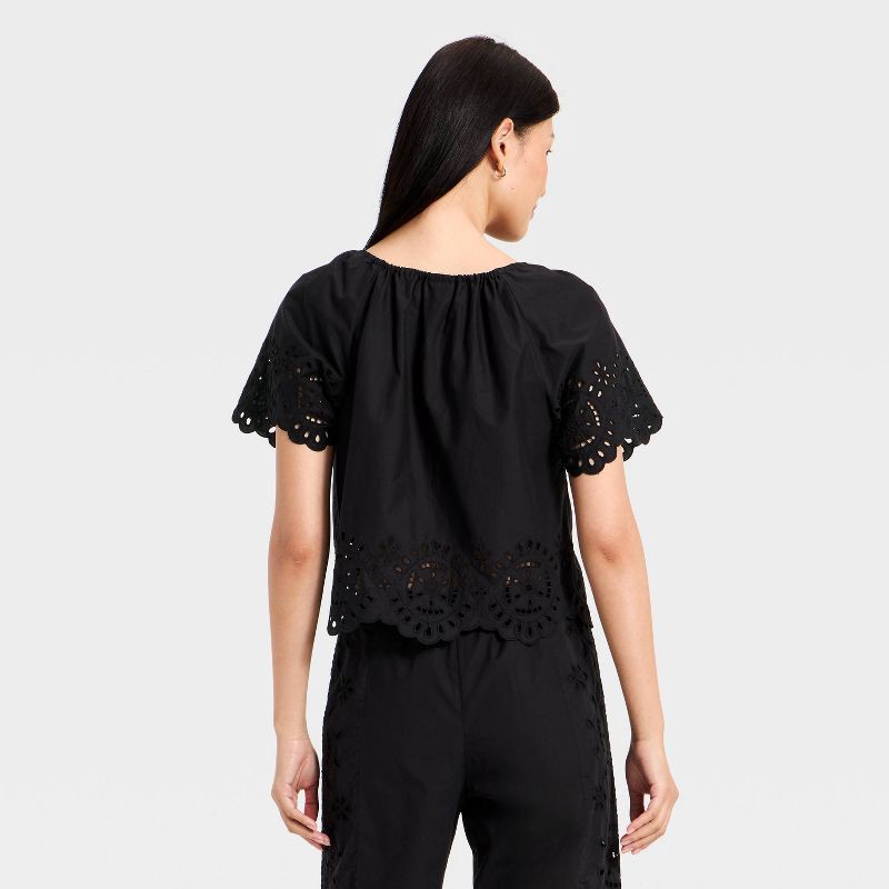 Women's Short Sleeve V-Neck Button-Front Eyelet Blouse - A New Day™ Black M