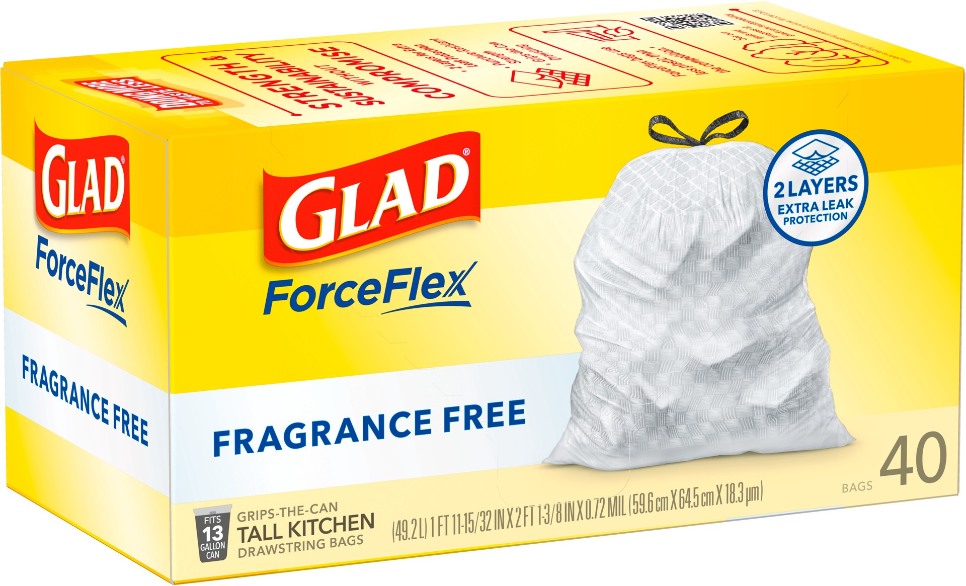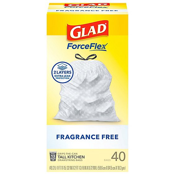 Glad Forceflex Fragrance Free Tall Kitchen Drawstring Trash Bags 13 Gallon - 40 Count
