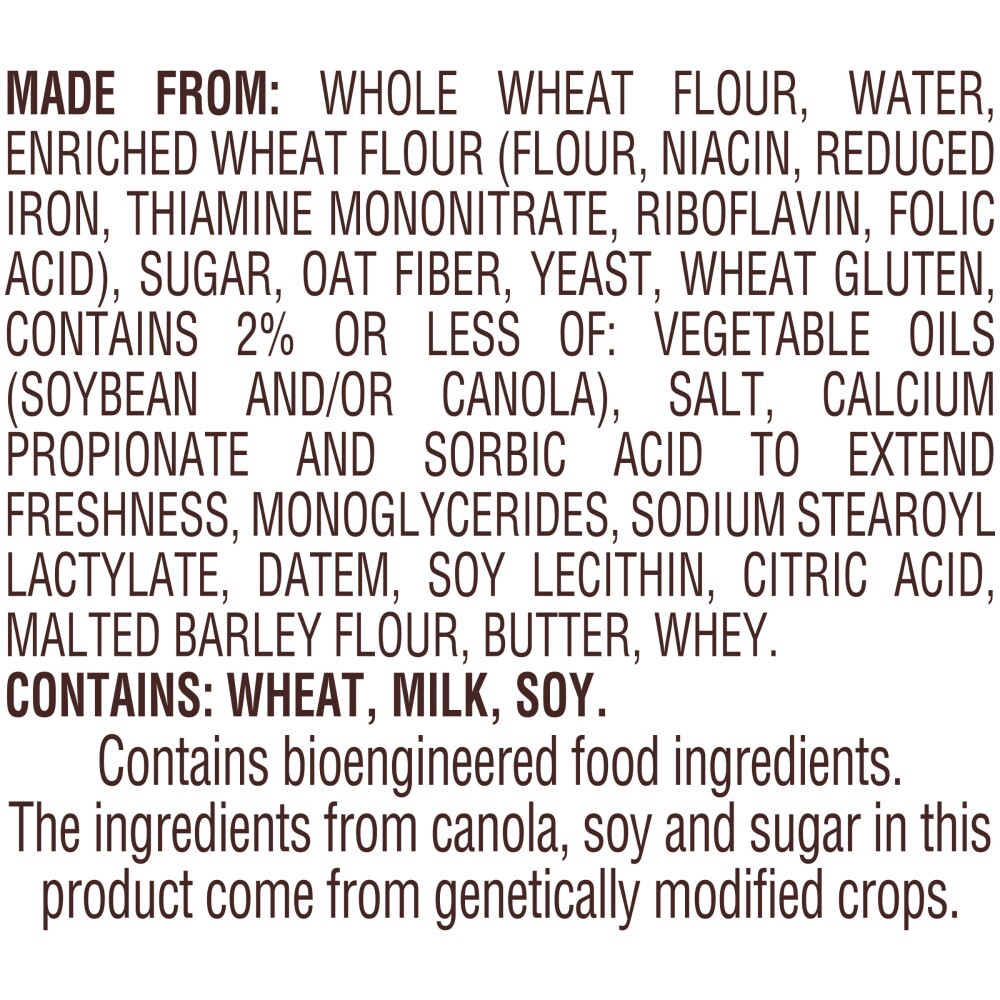 MADE FROM: WHOLE WHEAT FLOUR, WATER, ENRICHED WHEAT FLOUR (FLOUR, NIACIN, REDUCED IRON, THIAMINE MONONITRATE, RIBOFLAVIN, FOLIC ACID), SUGAR, OAT FIBER, YEAST, WHEAT GLUTEN, CONTAINS 2% OR LESS OF: VE…
