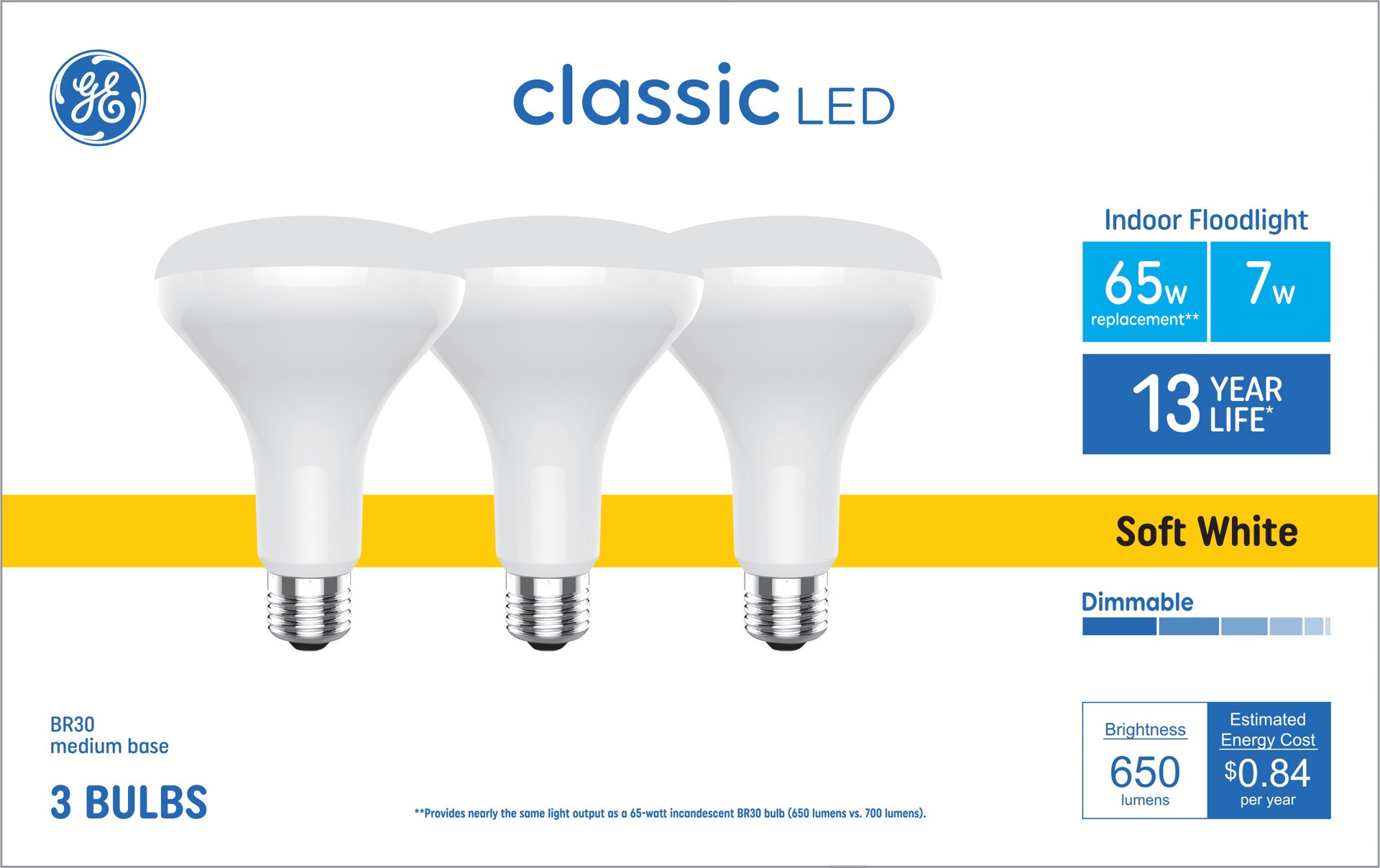 65-Watt replacement using only 7 Watts (650 lumens). Rated to last 13 years based on 3 hours per day use. Saves 95 dollars on energy costs per bulb versus 65-Watt BR30 incandescent over the bulb's lif…