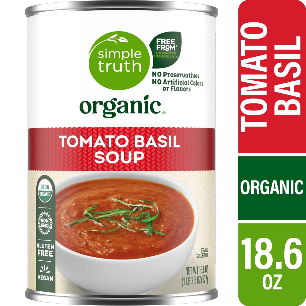 Simple Truth Organic® Tomato Basil Soup is a celebration of taste. Containing USDA organic tomatoes and basil, each spoonful is sure to satisfy as a gluten free and vegan delight. Crafted with no pres…