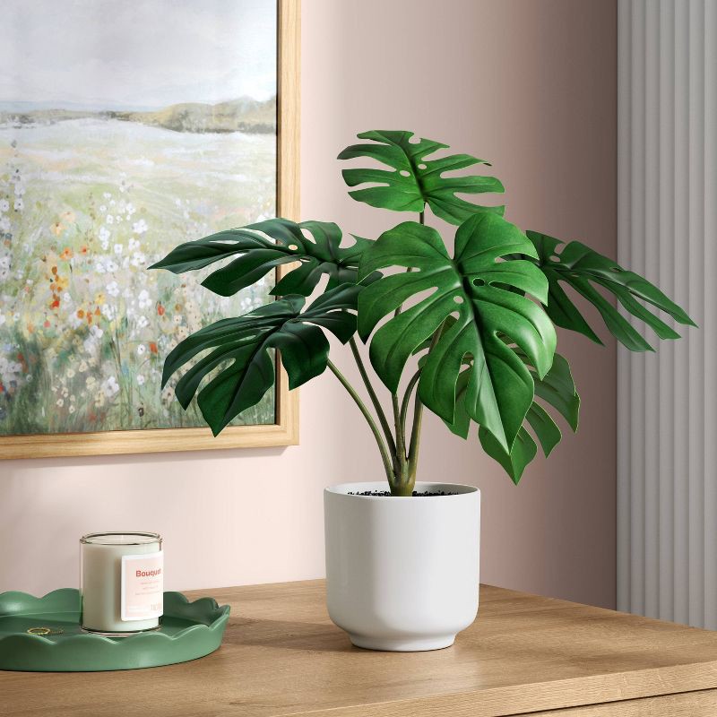 Create an eye-catching focal point in your indoor setting with this Artificial Monstera Potted Plant from Room Essentials™. This artificial potted plant showcases a lush green monstera inside a white …