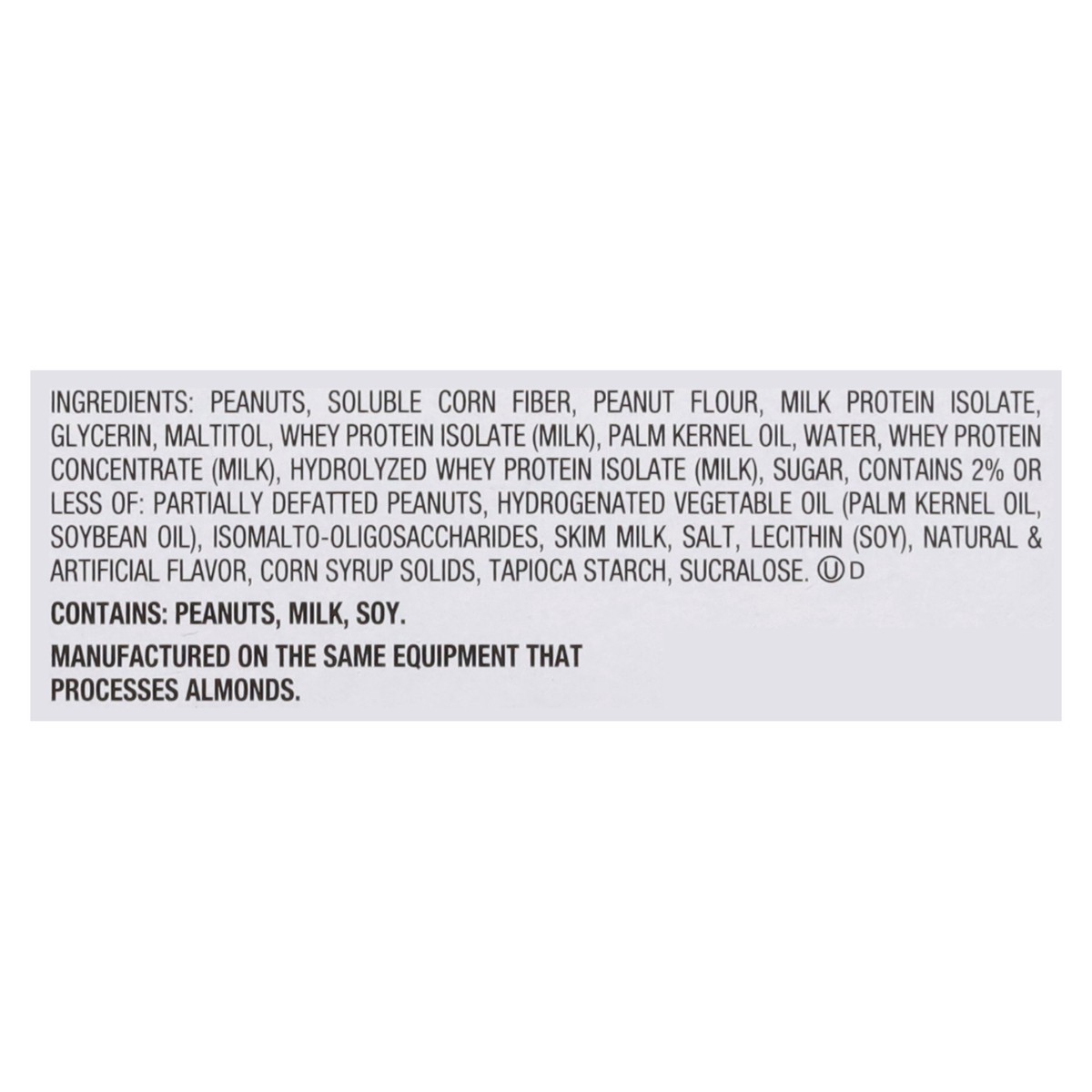Peanuts, Soluble Corn Fiber, Peanut Flour, Milk Protein Isolate, Glycerin, Maltitol, Whey Protein Isolate (Milk), Palm Kernel Oil, Water, Whey Protein Concentrate (Milk), Hydrolyzed Whey Protein Isola…