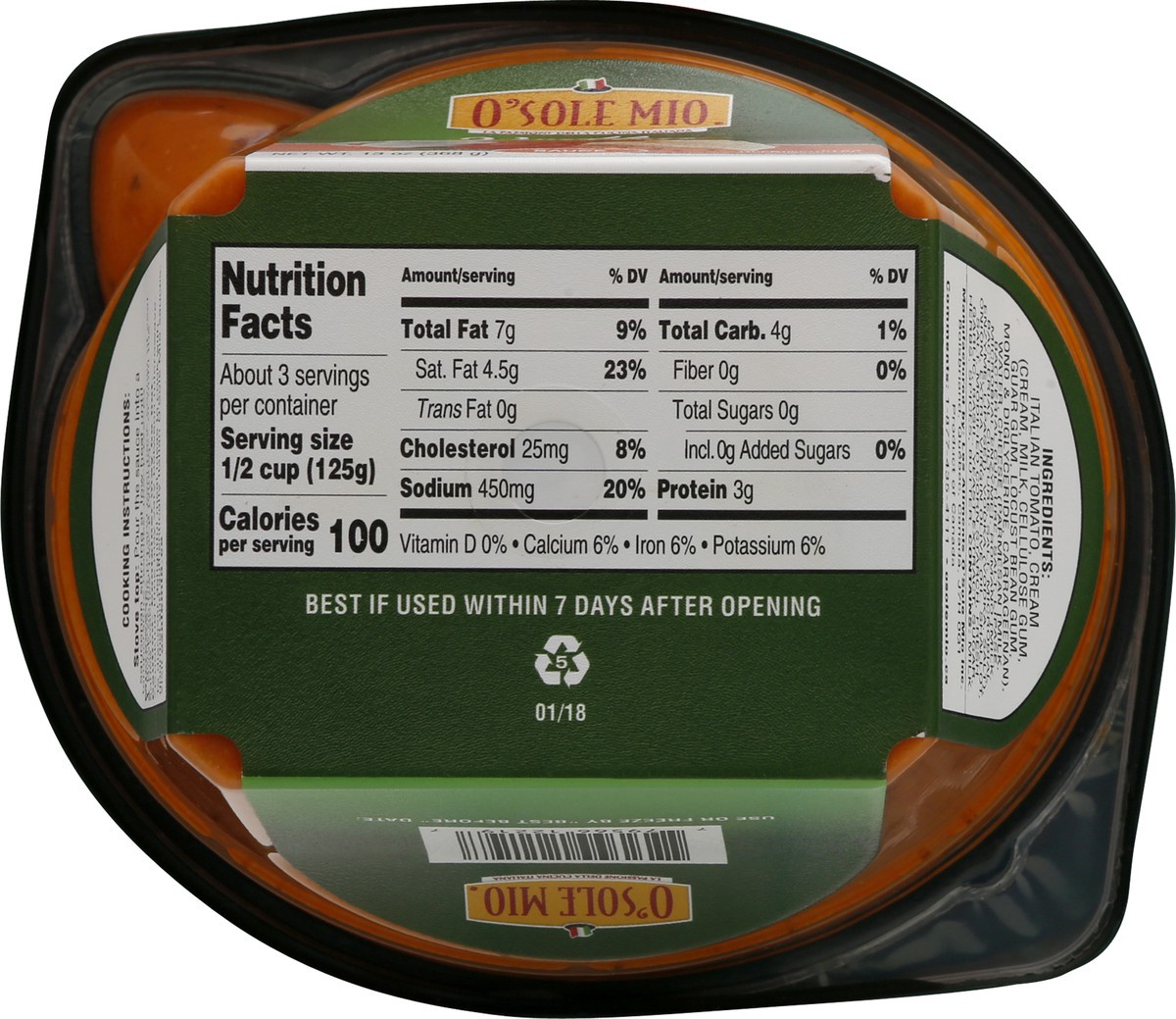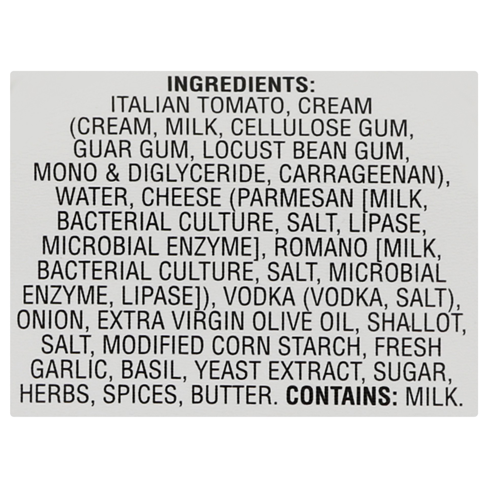 Italian Tomato, Cream (Cream, Milk, Cellulose Gum, Guar Gum, Locust Bean Gum, Mono & Diglyceride, Carrageenan), Water, Cheese (Parmesan [Milk, Bacterial Culture, Salt, Lipase, Microbial Enzyme], Roman…