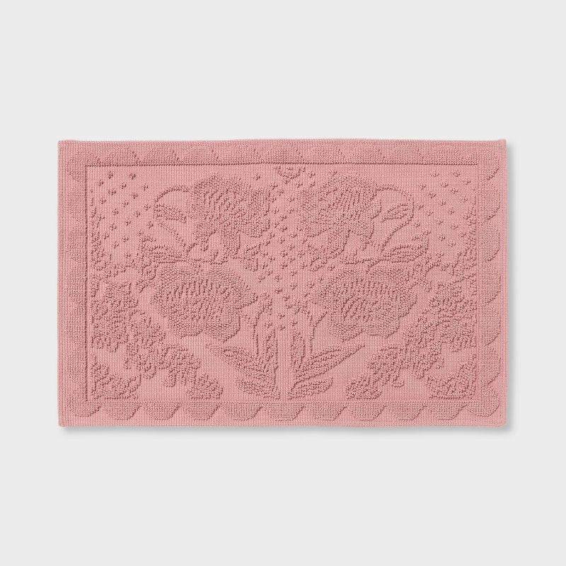 Transform your bath space with the eye-catching flair of this Valentine's Day Woven Jacquard Bath Rug from Threshold™. This rectangular bath rug features a raised floral pattern in pink for a charming…