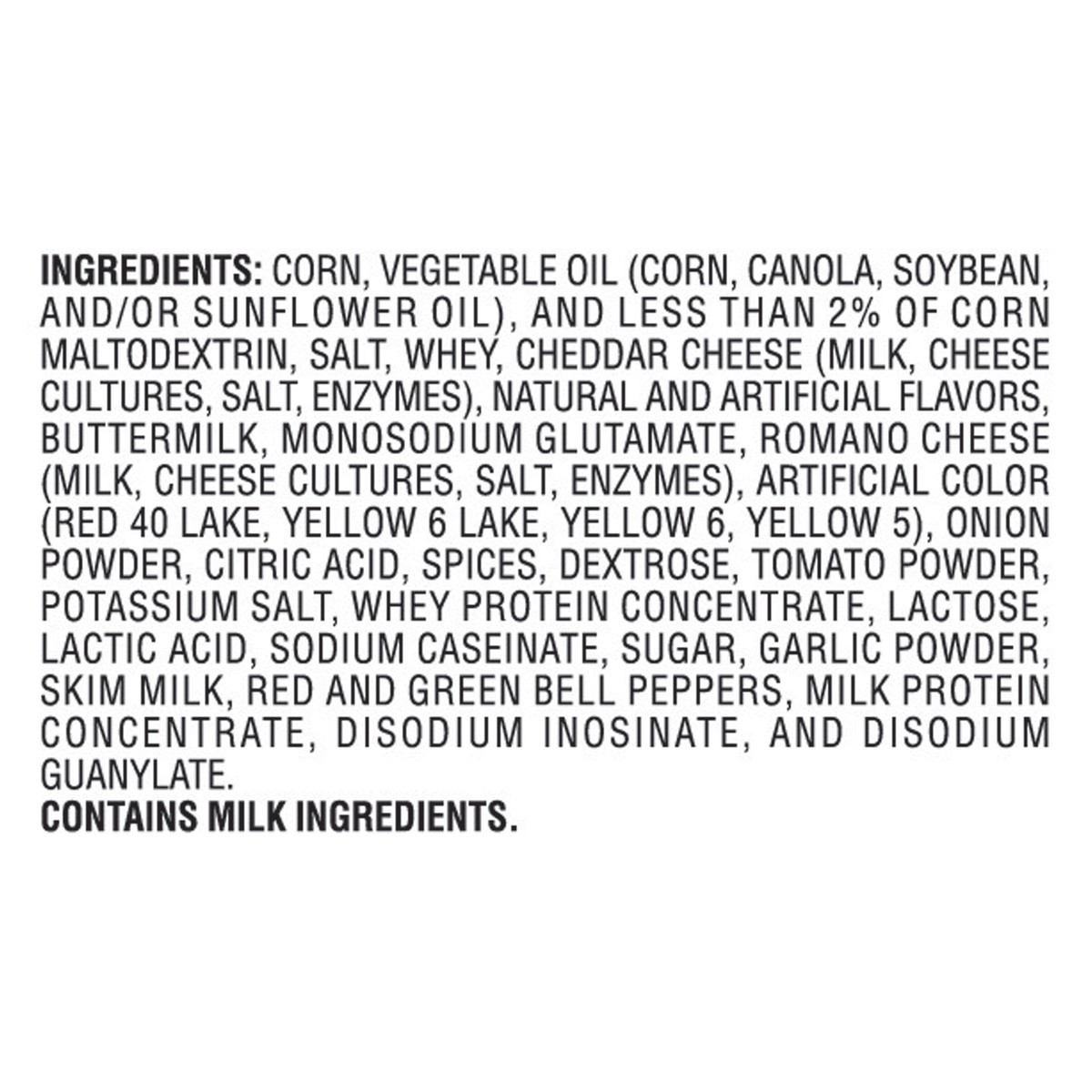 Corn, Vegetable Oil (Corn, Canola, Soybean, and/or Sunflower Oil), and Less than 2% of Corn Maltodextrin, Salt, Whey, Cheddar Cheese (Milk, Cheese Cultures, Salt, Enzymes), Natural and Artificial Flav…