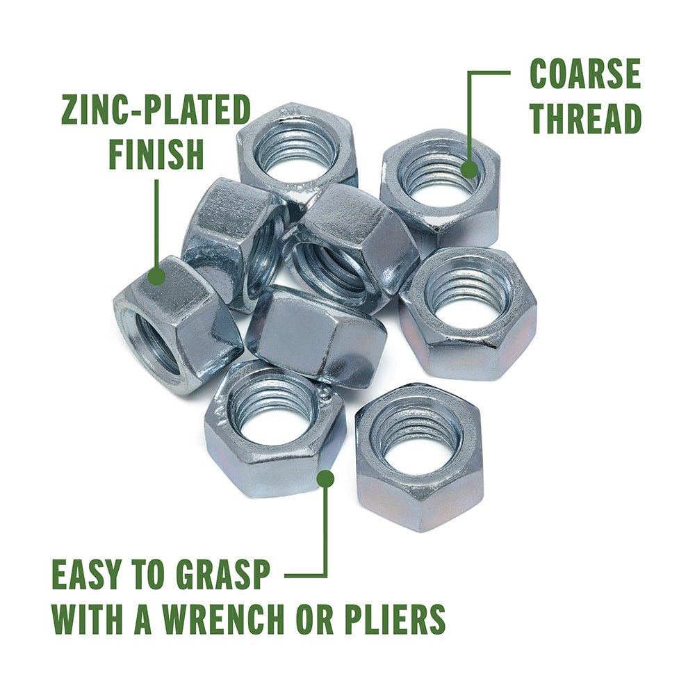 Hex nuts are designed to mechanically join materials by fastening to a bolt. Zinc finish offers moderate corrosion resistance. Can be installed by screwing onto exposed thread by hand and tightening w…