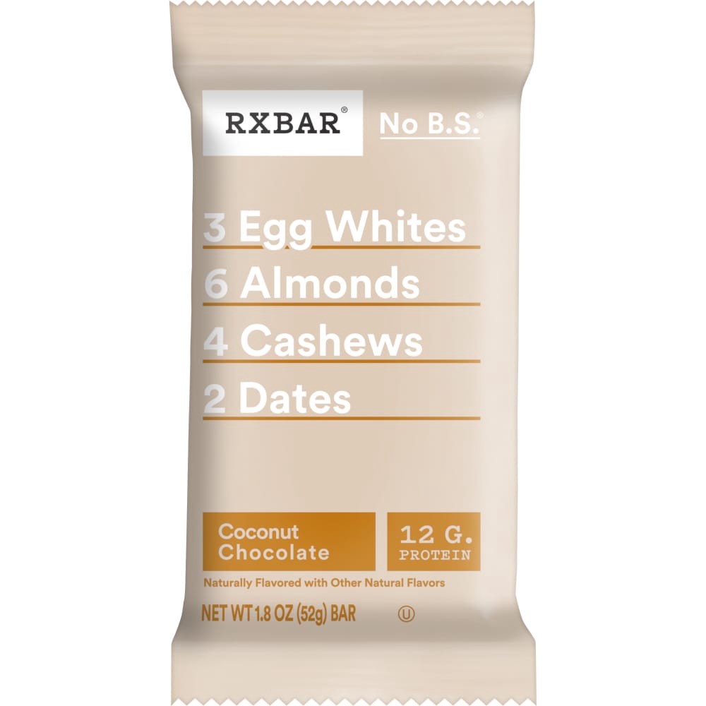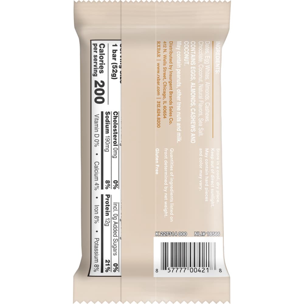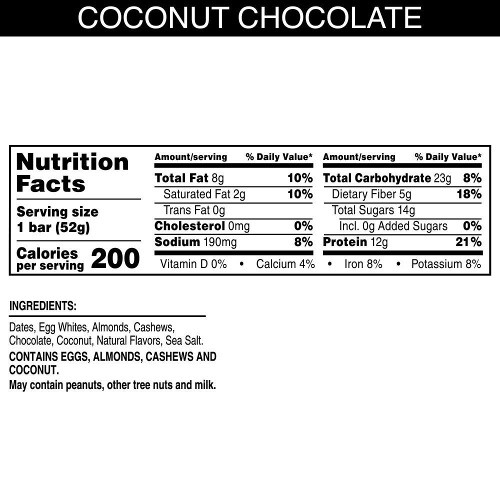 Dates, Egg Whites, Almonds, Cashews, Chocolate, Natural Flavors, Sea Salt, Coconut.