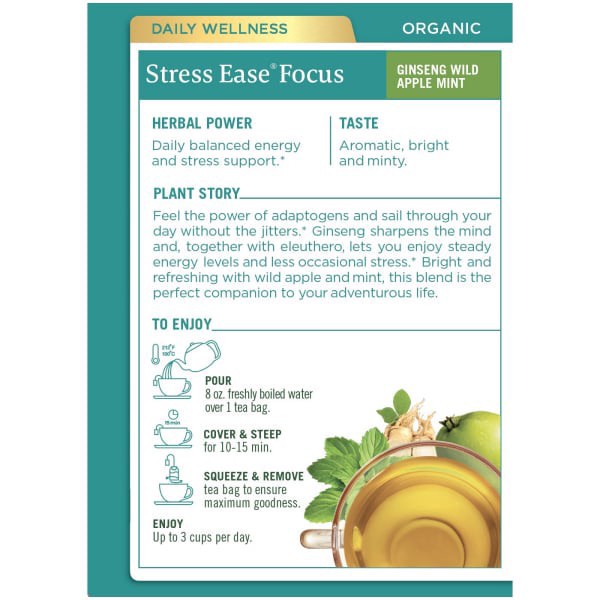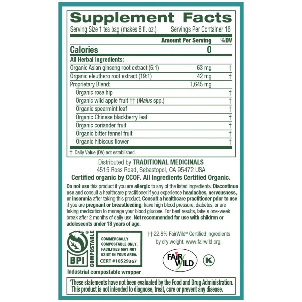 All Herbal Ingredients: Organic Asian Ginseng Root Extract (5:1), Organic Eleuthero Root Extract (19:1). Proprietary Blend: Organic Rose Hip, Organic Wild Apple Fruit(a) (Malus Spp.), Organic Spearmin…