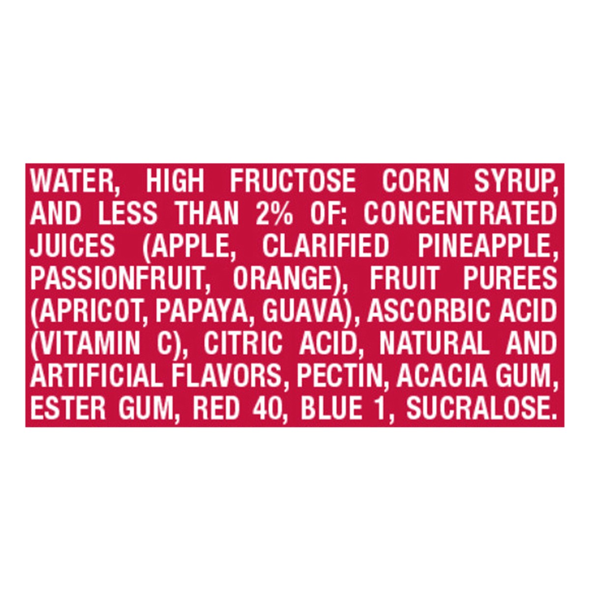 Water, High Fructose Corn Syrup, and Less than 2% of: Concentrated Juices (Apple, Clarified Pineapple, Passionfruit, Orange), Fruit Purees (Apricot, Papaya, Guava), Ascorbic Acid (Vitamin C), Citric A…