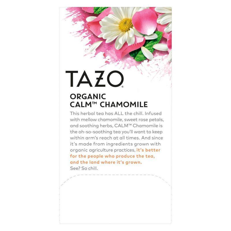 TAZO Organic Calm Chamomile is made from a robust blend of chamomile flowers, hibiscus flowers, spearmint leaves, rose petals, lemongrass, and blackberry leaves. Our Organic Chamomile comes packaged w…