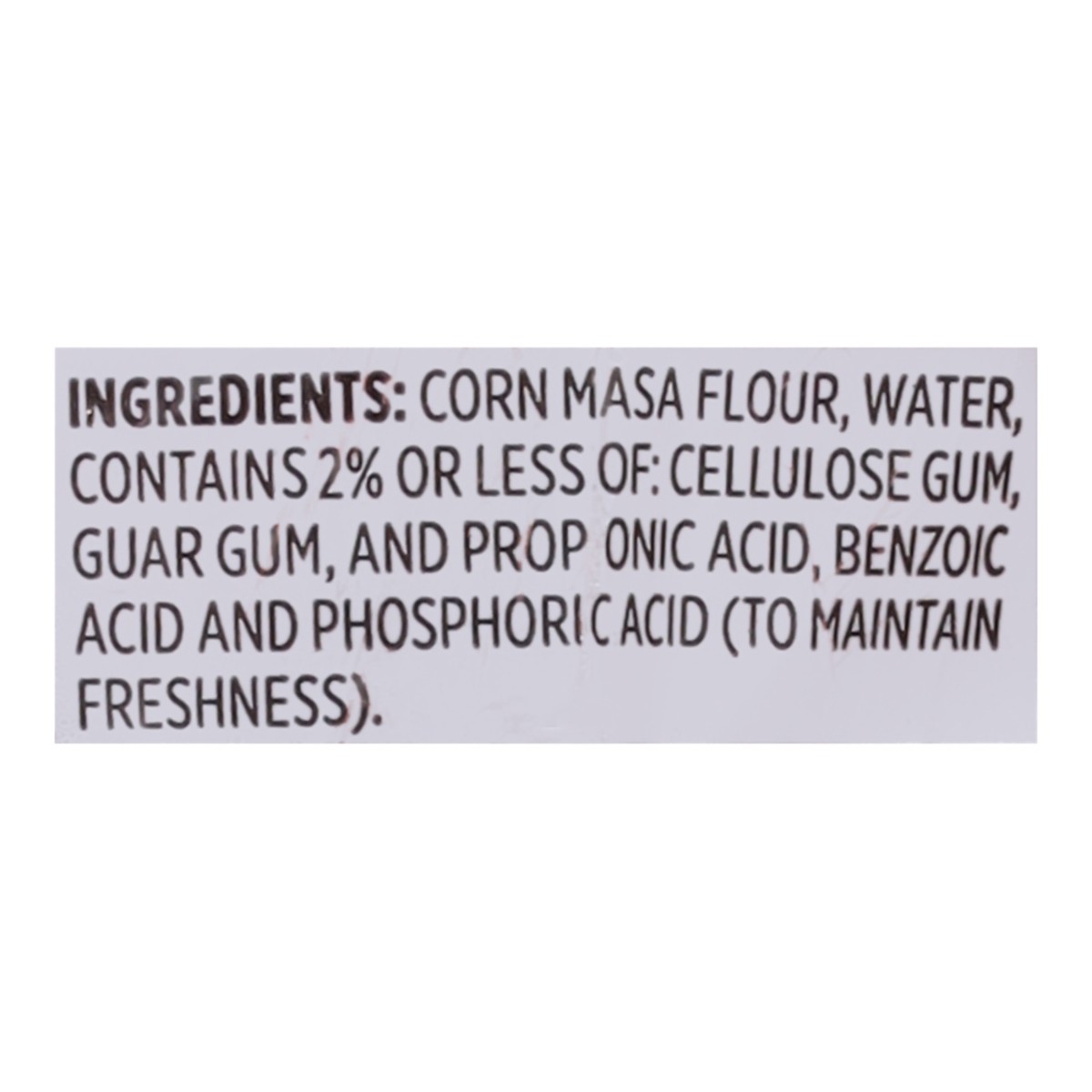Corn Masa Flour, Water, Contains 2% or Less of: Cellulose Gum, Guar Gum, and Propionic Acid, Benzoic Acid and Phosphoric Acid (to Maintain Freshness).