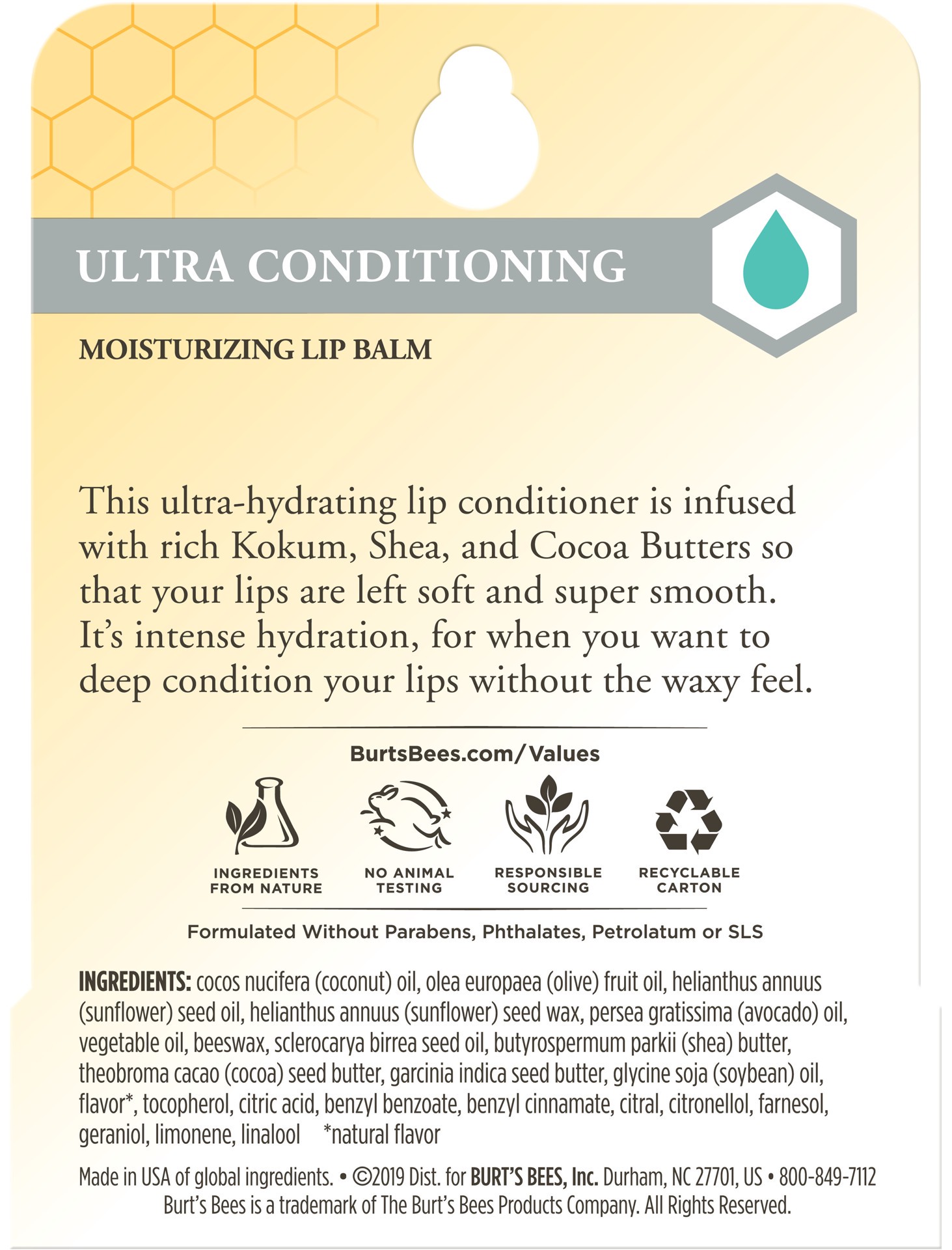 Burt''s Bees Ultra Conditioning Lip Balm instantly softens and hydrates your lips to help prevent dryness, cracking or chapping. Infused with nature''s finest ingredients, like kokum butter, shea butt…