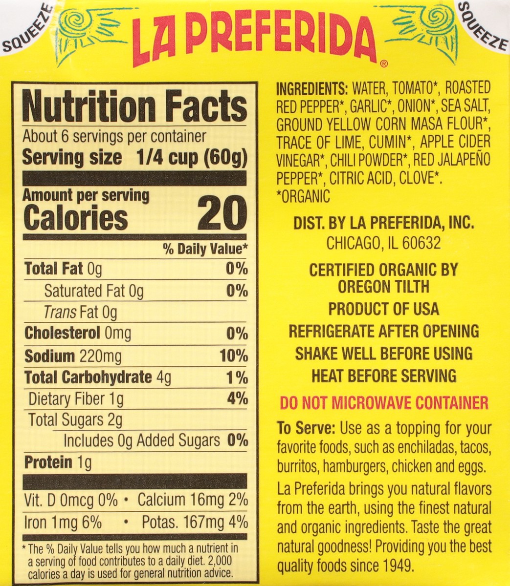 Water, Tomato*, Roasted Red Pepper*, Garlic*, Onion*, Sea Salt, Ground Yellow Corn Masa Flour*, Trace of Lime, Cumin*, Apple Cider Vinegar*, Chili Powder*, Red Jalapeno Pepper*, Citric Acid, Clove*. *…