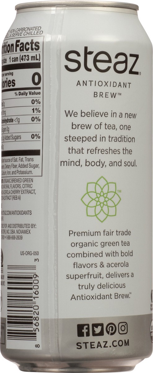 Antioxidant (Go to www.steaz.com/antioxidants for more info). We believe in a new brew of tea, one steeped in tradition that refreshes the mind, body, and soul. Premium fair trade organic green tea co…