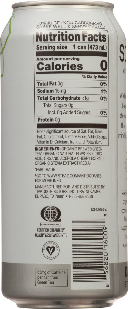 Antioxidant (Go to www.steaz.com/antioxidants for more info). We believe in a new brew of tea, one steeped in tradition that refreshes the mind, body, and soul. Premium fair trade organic green tea co…