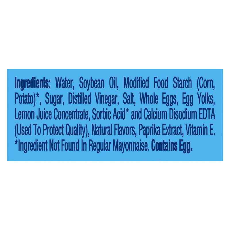 WATER, SOYBEAN OIL, MODIFIED FOOD STARCH (CORN, POTATO)**, SUGAR, DISTILLED VINEGAR, WHOLE EGGS AND EGG YOLKS, SALT, LEMON JUICE CONCENTRATE, SORBIC ACID ** AND CALCIUM DISODIUM EDTA (USED TO PROTECT …