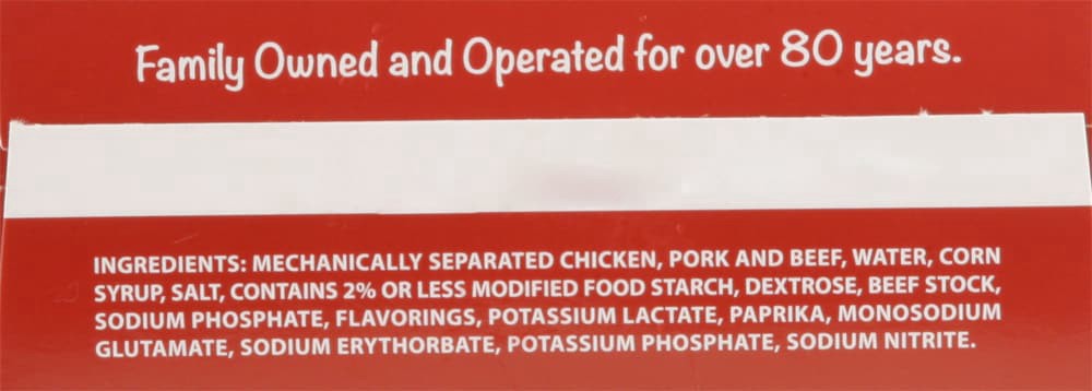 Mechanically Separated Chicken, Pork and Beef, Water, Corn Syrup, Salt, Contains 2% or Less Modified Food Starch, Dextrose, Beef Stock, Sodium Phosphate, Flavorings, Potassium Lactate, Paprika, Monoso…