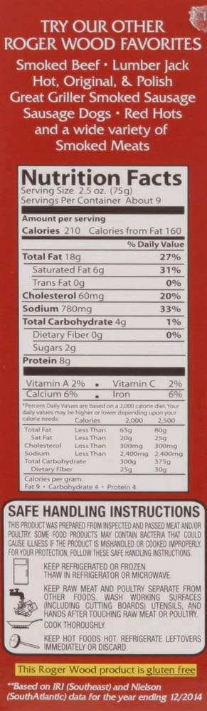 The original. Made with chicken, pork and beef. Great tastin good. Inspected for wholesomeness by US Department of Agriculture. This Roger Wood product is gluten free. For product info and recipes vis…