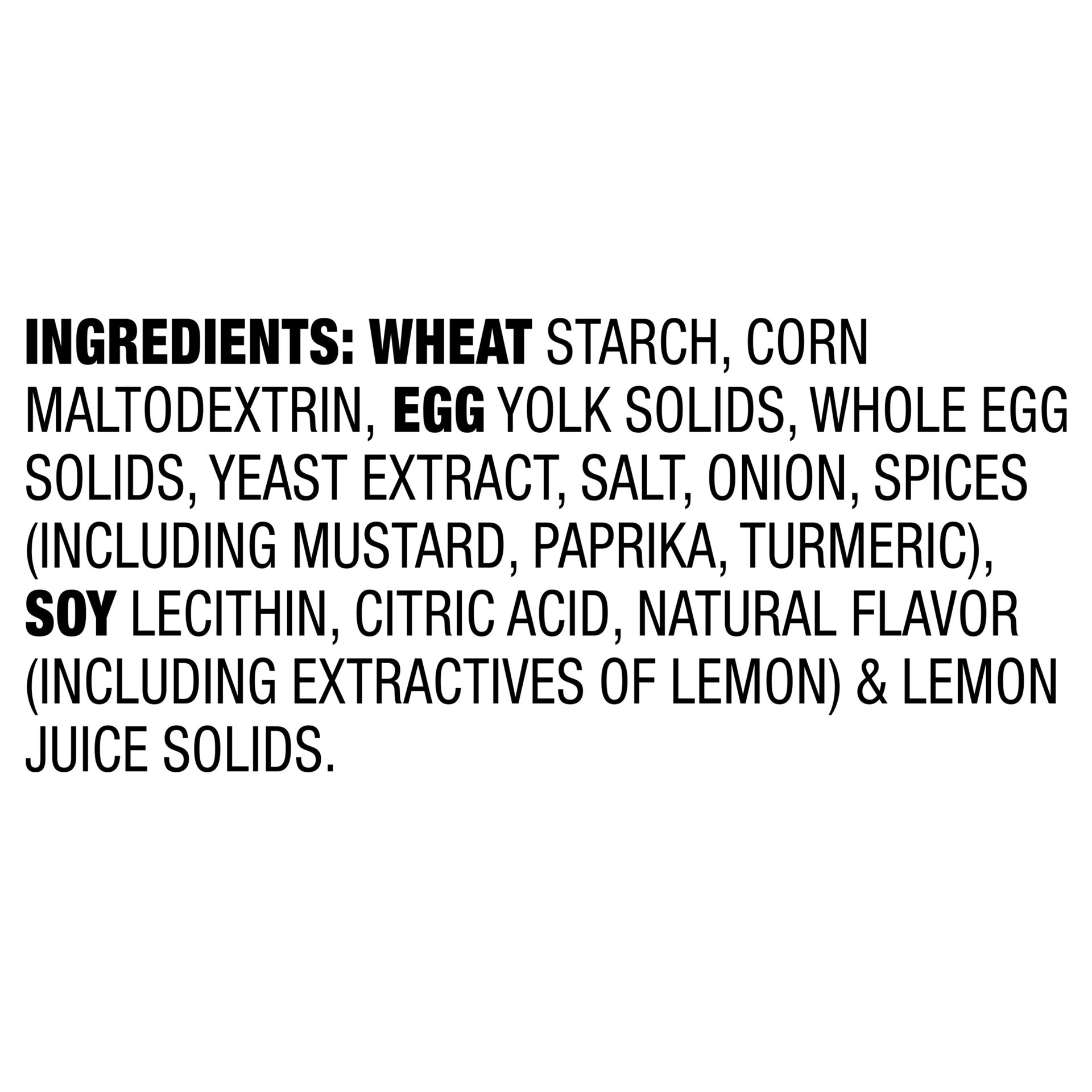 Wheat Starch, Corn Maltodextrin, Whole Egg Solids, Egg Yolk Solids, Yeast Extract, Salt, Onion, Spices (Including Mustard, Paprika, Turmeric), Soy Lecithin, Citric Acid, Natural Flavors (Including Ext…