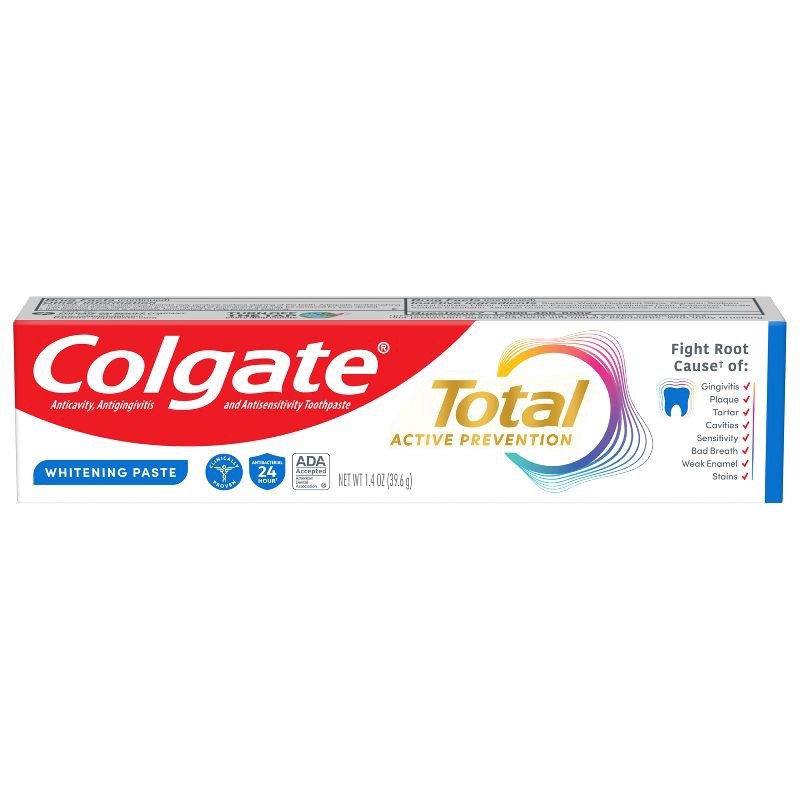 - Includes one (1) 1.4 oz travel size tube of Colgate Total Active Prevention Travel Whitening Toothpaste, Mint