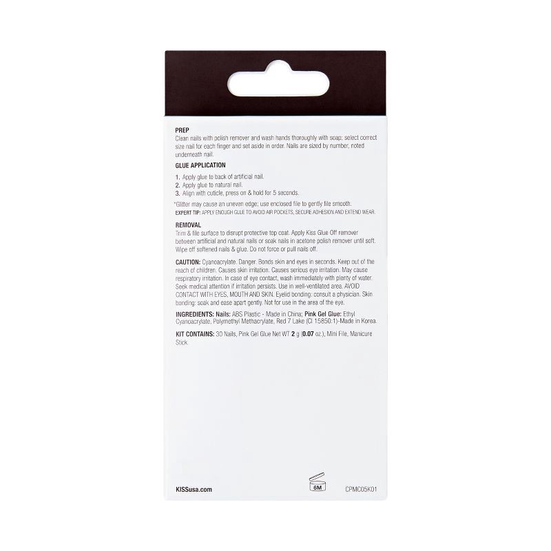 Nails: ABS Plastic. Pink Gel Glue: Ethyl Cyanoacrylate, Polymethyl Methacrylate, Red 7 Lake (CI 15850:1).