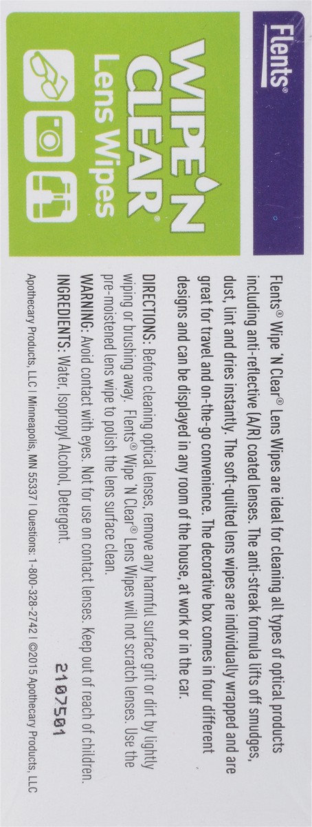 Great for cleaning eye glasses & other optical products. Flents. Wipe 'N Clear Lens Wipes are ideal for cleaning all types of optical products including anti-reflective (A/R) coated lenses. The anti-s…