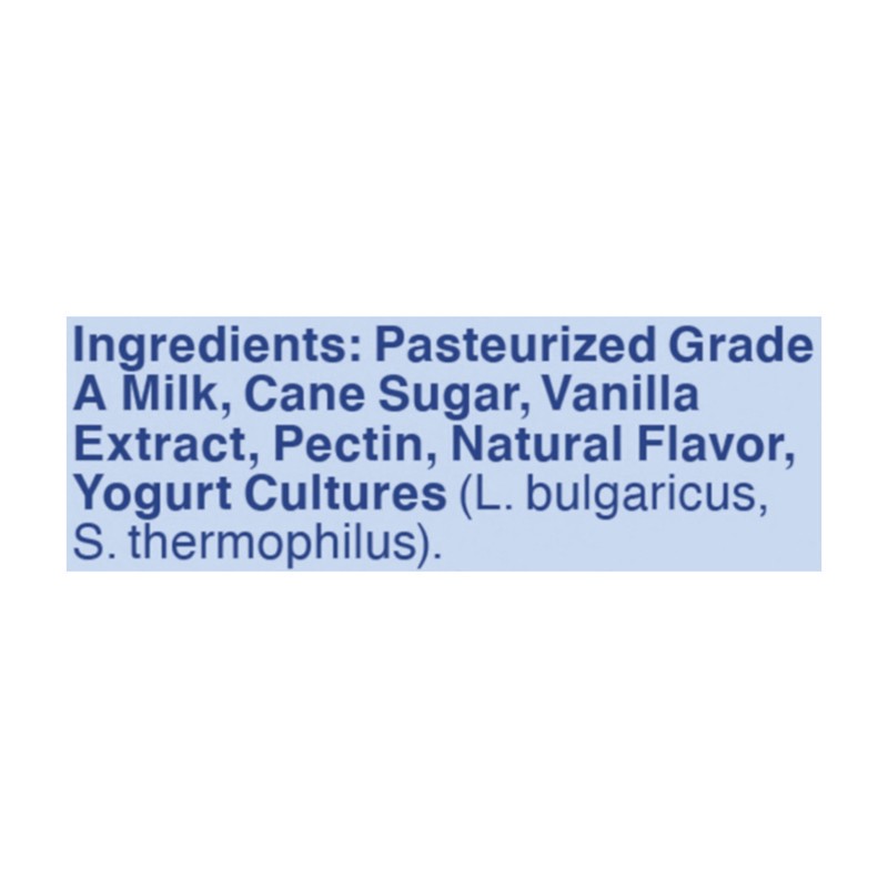 Pasteurized Grade A Milk, Cane Sugar, Vanilla Extract, Pectin, Natural Flavor, Yogurt Cultures (L. Bulgaricus, S. Thermophilus).