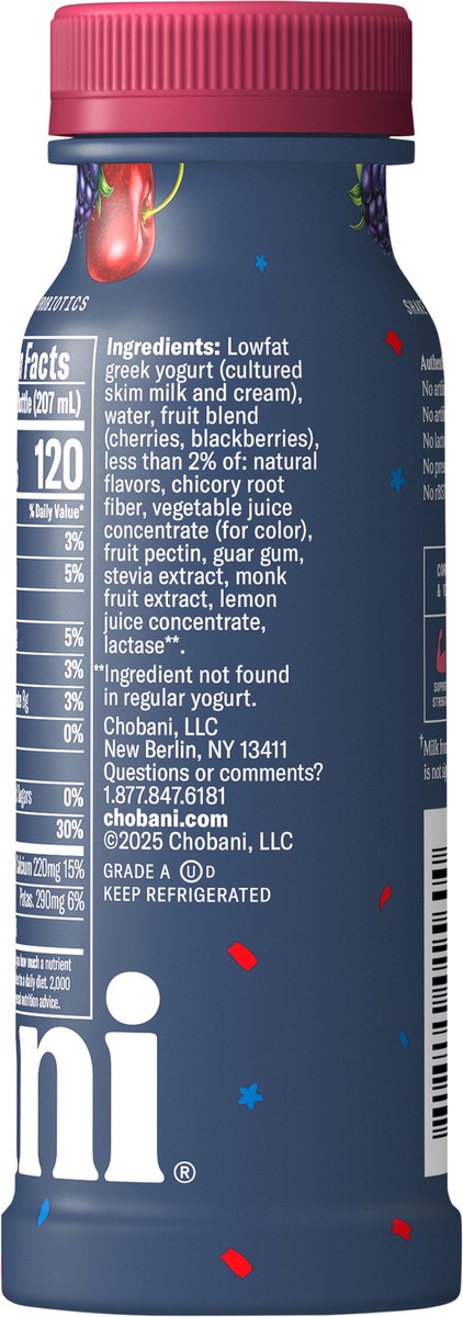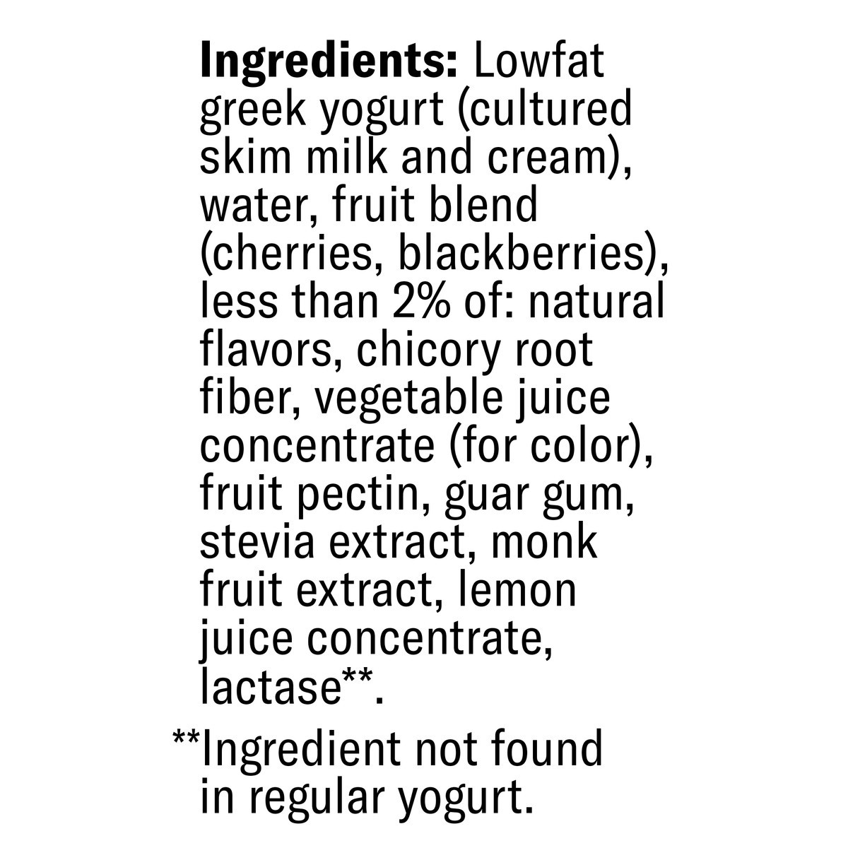 Lowfat Greek Yogurt (Cultured Skim Milk and Cream), Water, Fruit Blend (Cherries, Blackberries), Less than 2% of: Natural Flavors, Chicory Root Fiber, Vegetable Juice Concentrate (for Color), Fruit Pe…