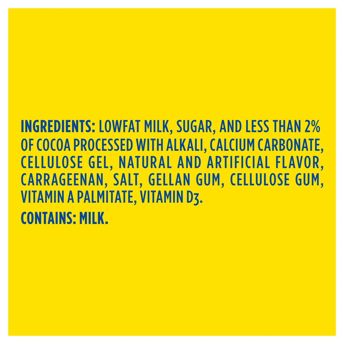 LOWFAT MILK, SUGAR, AND LESS THAN 2% OF COCOA PROCESSED WITH ALKALI, CALCIUM CARBONATE, CELLULOSE GEL, NATURAL AND ARTIFICIAL FLAVOR, CARRAGEENAN, SALT, GELLAN GUM, CELLULOSE GUM, VITAMIN A PALMITATE,…