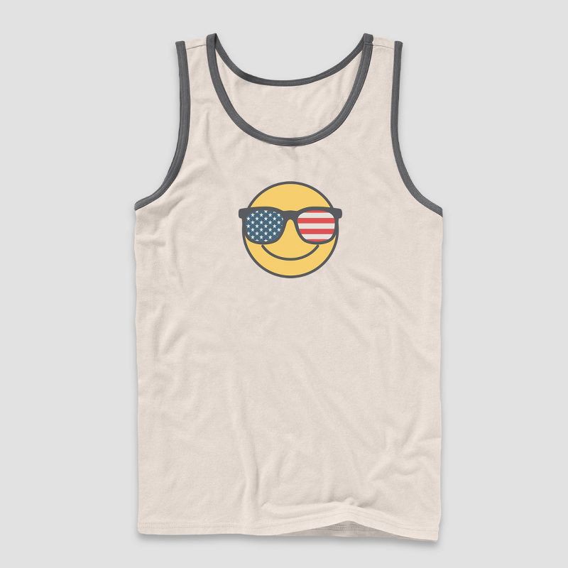 Stay comfortable all day in this Men's Americana Smiley Face Print Tank Top and Shorts Pajama Set – Light Beige/Charcoal Gray. The tank top features a pullover closure, while the shorts are designed w…