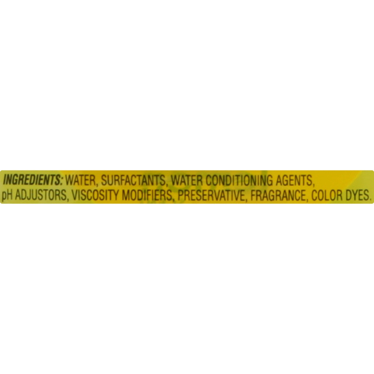 Water, Surfactants, Water Conditioning Agents, pH Adjustors, Viscosity Modifiers, Preservative, Fragrance, Color Dyes.