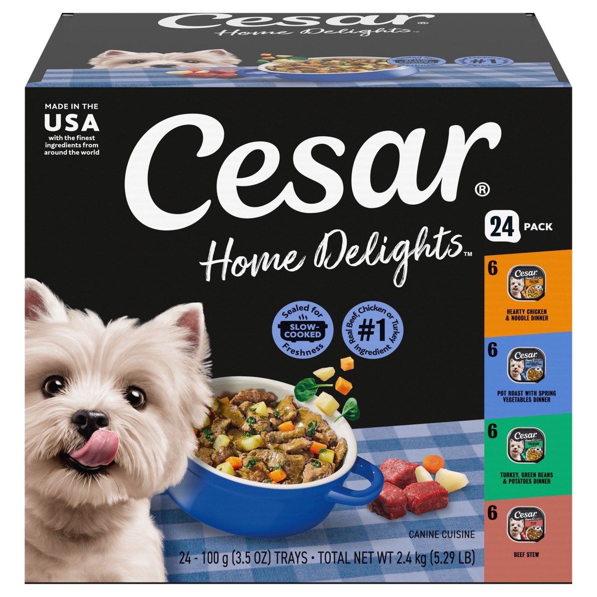 - Contains one (1) 24 count case of 3.5 oz trays of CESAR HOME DELIGHTS Wet Dog Food Variety Pack: (6) Pot Roast & Vegetable