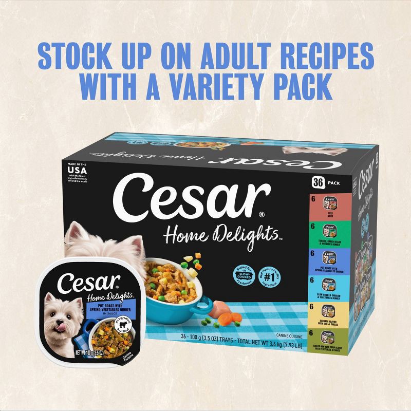 - Variety Pack: Contains twenty-four (24) 3.5 oz. pack of Cesar Home Delights Adult Wet Dog Food: (6) Pot Roast with Spring Vegetables Dinner in Sauce, (6) Beef Stew, (6) Turkey, Green Beans, & Potatoes Dinner in Sauce, and (6) Hearty Chicken & Noodle Dinner in Sauce.