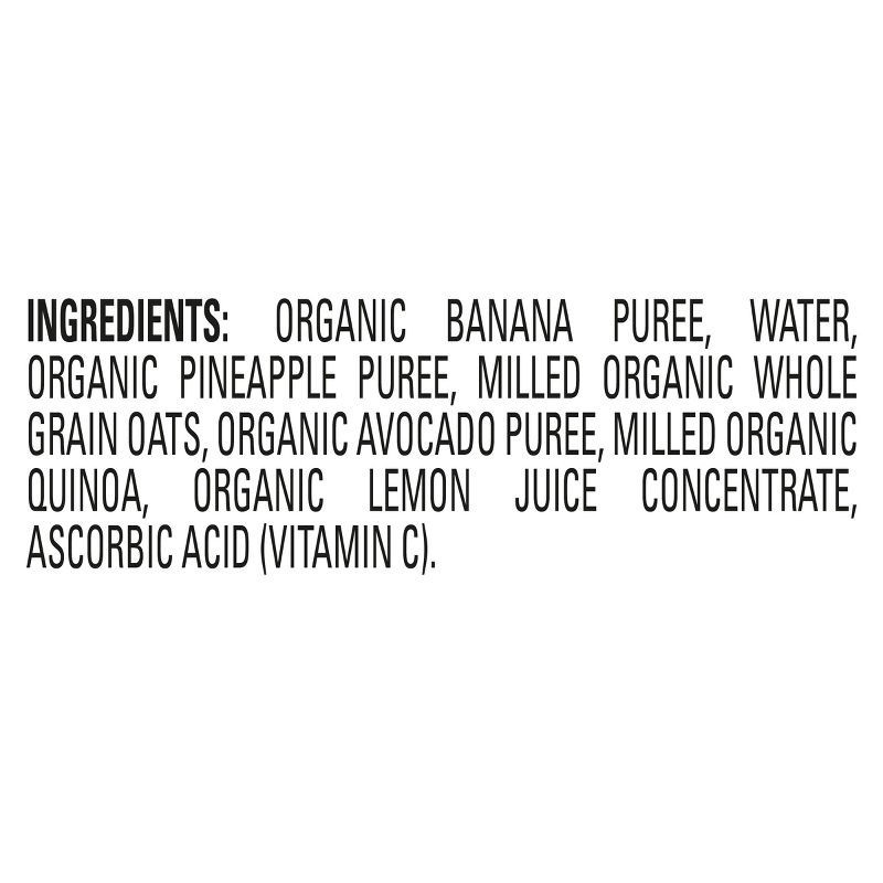Organic Banana Puree, Water, Organic Pineapple Puree, Milled Organic Whole Grain Oats, Organic Avocado Puree, Milled Organic Quinoa, Organic Lemon Juice Concentrate, Ascorbic Acid (Vitamin C)