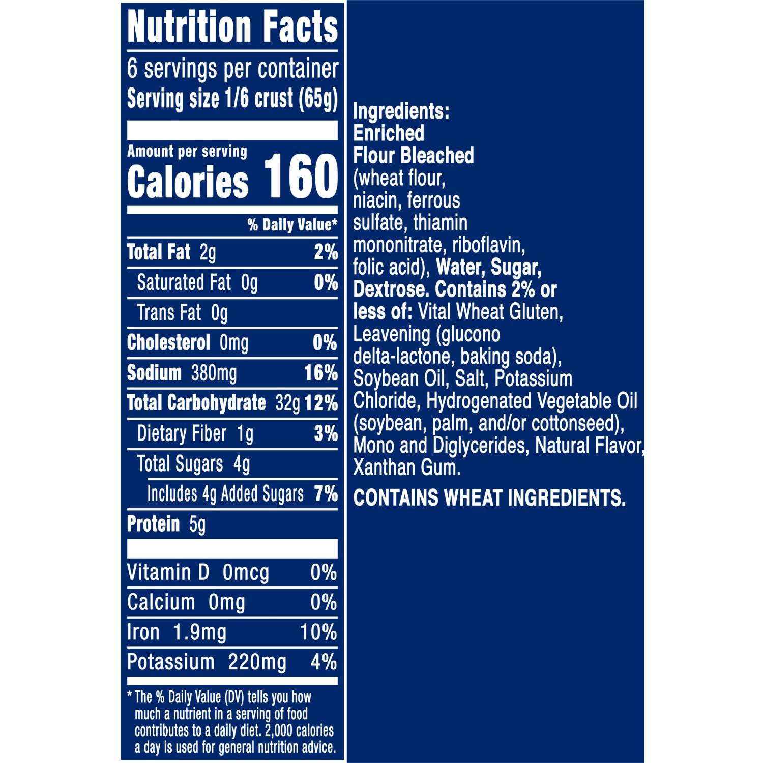 Enriched Flour Bleached Wheat Flour, Niacin, Ferrous Sulfate, Thiamin Mononitrate, Riboflavin, Folic Acid), Water, Sugar, Dextrose, Contains 2% or Less of: Vital Wheat Gluten, Leavening (Glucono Delta…