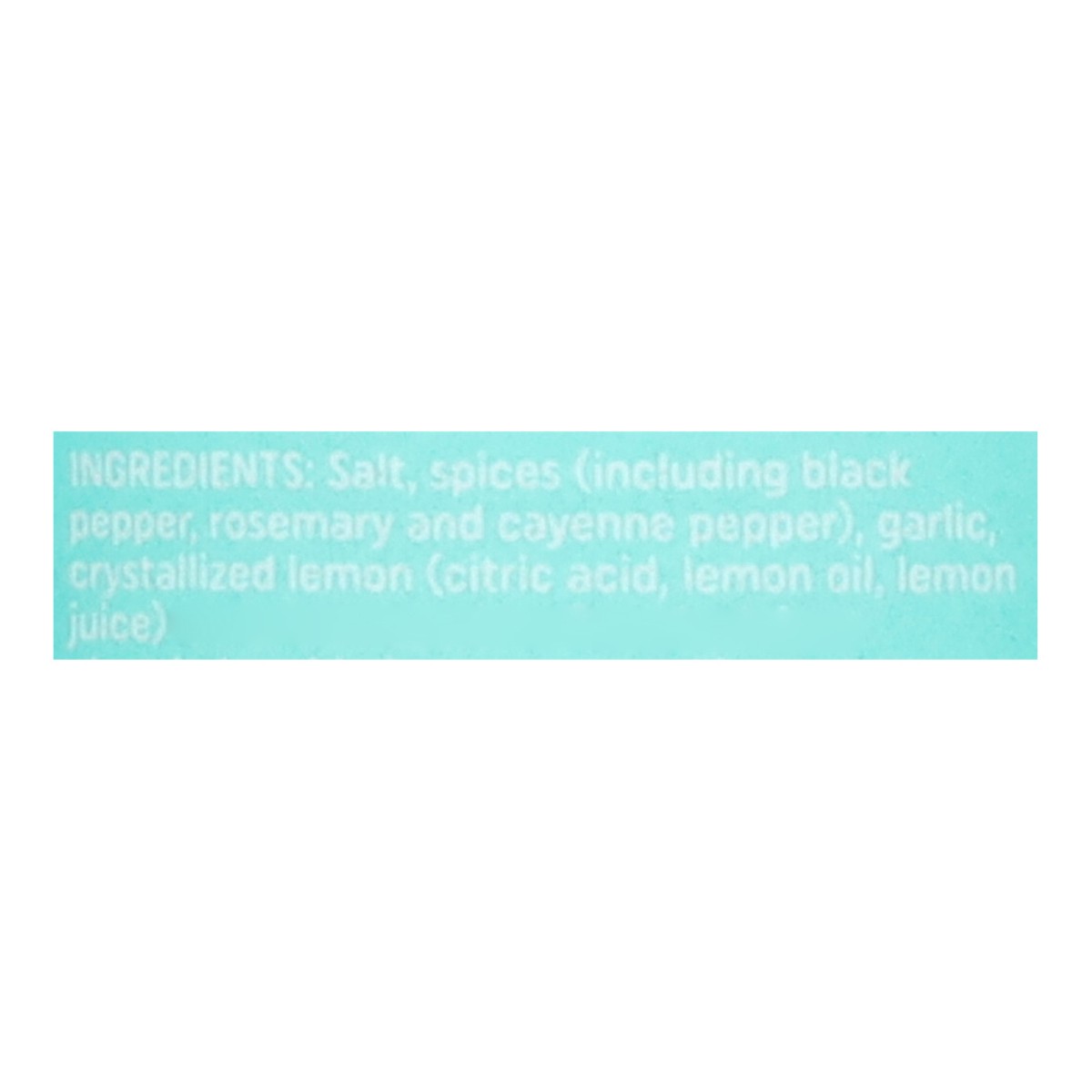 Salt, Spices (Including Black Pepper, Rosemary and Cayenne Pepper), Garlic, Crystallized Lemon (Citric Acid, Lemon Oil, Lemon Juice) and Not More than 2% Tricalcium Phosphate Added to Prevent Caking.