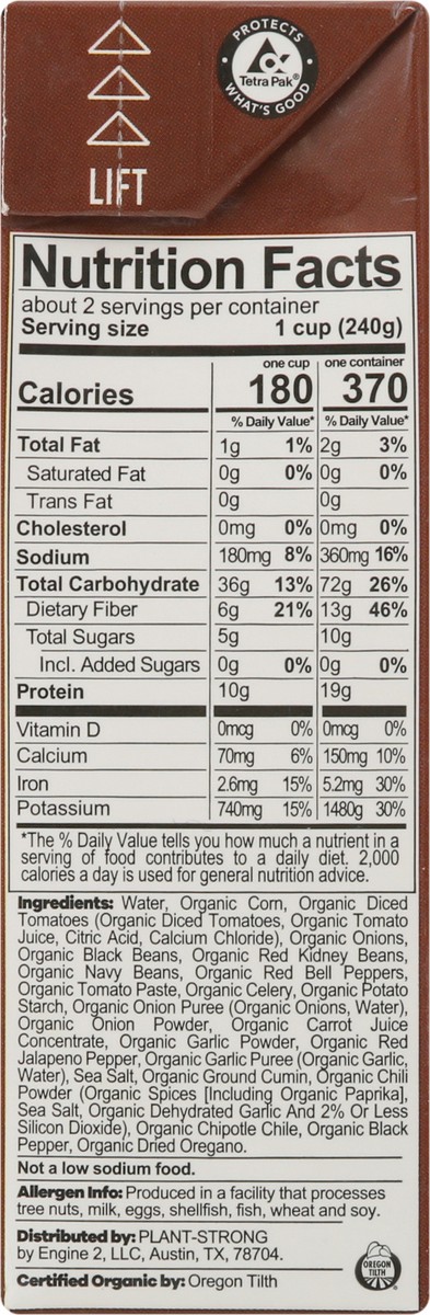 Filtered Water, Corn*, Diced Tomatoes in Juice* (Diced Tomatoes*, Tomato Juice*, Citric Acid, Calcium Chloride), Onions*, Black Beans*, Red Kidney Beans*, Navy Beans, Red Bell Peppers*, Carrot Juice*,…