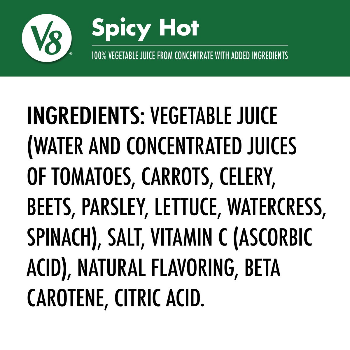 Savor the goodness of V8 Spicy Hot 100% Vegetable Juice. A satisfying alternative to other juices, this spicy V8 juice is made with concentrated tomato juice along with the juices of seven other veget…