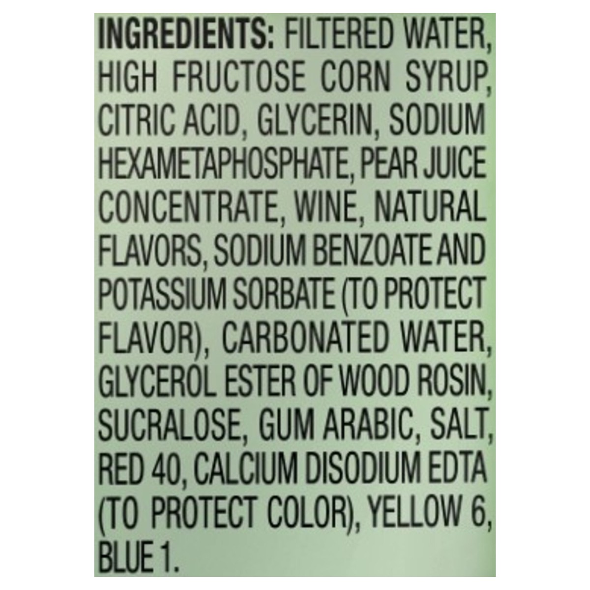 Filtered Water, High Fructose Corn Syrup, Citric Acid, Glycerin, Sodium Hexametaphosphate, Pear Juice Concentrate, Wine, Natural Flavors, Sodium Benzoate and Potassium Sorbate (to Protect Flavor), Car…