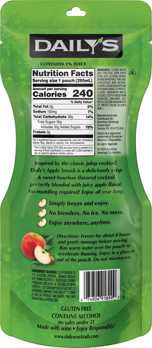 Inspired by the classic julep cocktail, Daily''s Apple Smash is a deliciously sweet bourbon flavored cocktail perfectly blended with sweet apple flavor. This 10 fl oz frozen cocktail pouch is made wit…